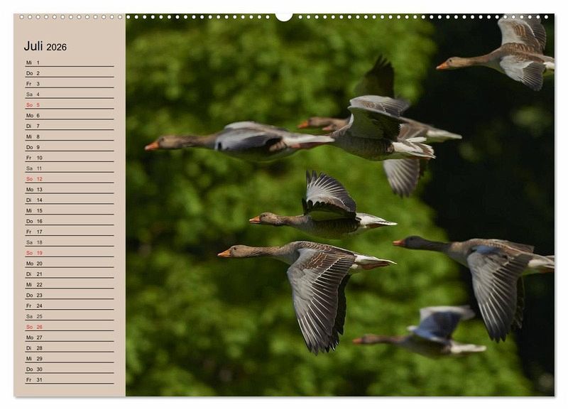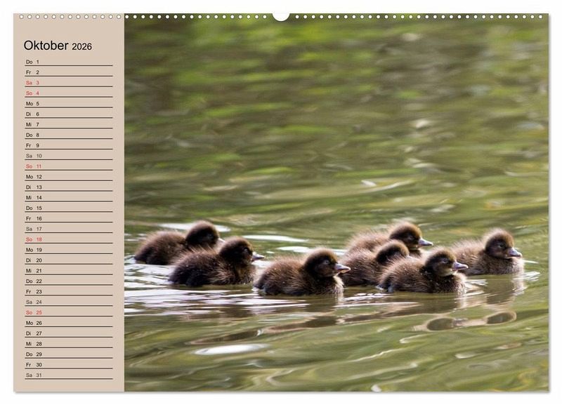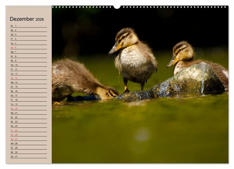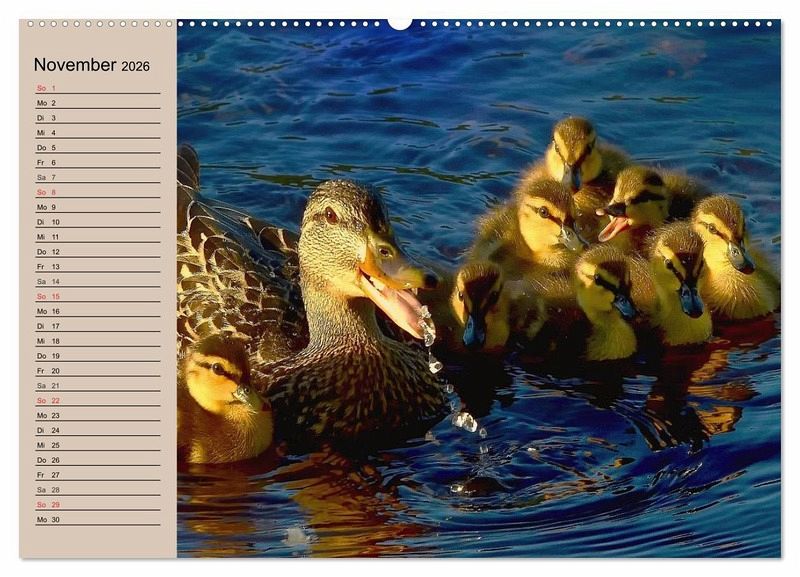 Watschelnde Wasservögel sind lustig anzusehen. Aber Gänse und Enten sind nicht nur tollpatschig wirkende Fußgänger, sie sind auch sehr elegante Schwimmer, sie können abtauchen und auch fliegen. Es ist wunderschön eine Enten- oder Gänsefamilie mit niedlichen Küken, bei ihrem fröhlichen Treiben zu beobachten. Ein schöner Planer für die gesamte Familie.