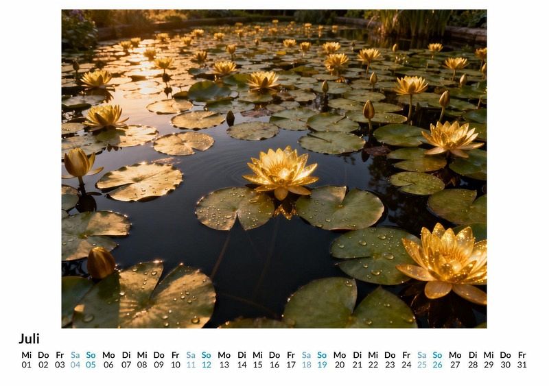 Licht tanzt auf Seerosen, Farben verschwimmen zu einer Symphonie aus Blüten und Blättern. Der Kalender "Gärten im Stil des Impressionismus" fängt die flüchtigen Momente des Lichts in verträumten Gartenanlagen ein und bringt die Poesie dieser Kunstrichtung in den Alltag. Dieser Kalender ist eine ideale Wahl: Für Liebhaber der impressionistischen Kunst und ihrer besonderen Lichtstimmung. Für Menschen mit einer Leidenschaft für Gärten und florale Motive. Für alle, die einen farbenfrohen und stilvollen Wandschmuck für das ganze Jahr suchen. Jedes Monatsblatt entfaltet eine neue Gartenlandschaft, die von den großen Meistern des Impressionismus inspiriert ist. Diese Szenen wurden nicht mit dem Pinsel, sondern durch die Interpretation von visuellen Informationen und künstlerischen Stilen durch moderne Algorithmen erschaffen. Das Ergebnis sind Kompositionen, in denen sich die Grenzen zwischen Realität und Traum auflösen und die Schönheit der Natur in leuchtenden Farben gefeiert wird. Mit dem Kauf dieses Kalenders erhält man: Zwölf einzigartige, farbintensive Monatsmotive. Ein praktisches Kalendarium für Termine und Notizen. Einen ästhetischen Begleiter durch das ganze Jahr. Dieser Kalender ist eine Hommage an die Schönheit des Lichts und die Pracht der Gärten. Er lädt dazu ein, die zwölf Kompositionen zu entdecken und sich Monat für Monat von ihrer besonderen Atmosphäre inspirieren zu lassen.