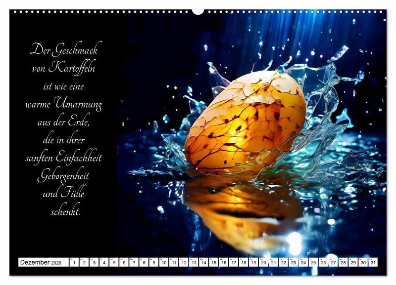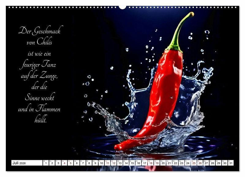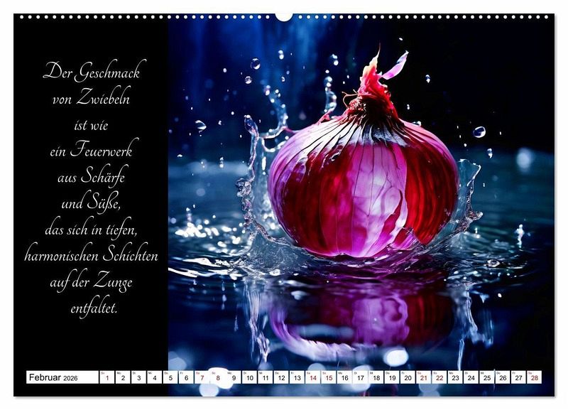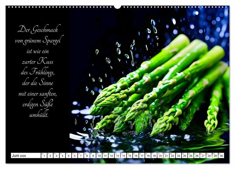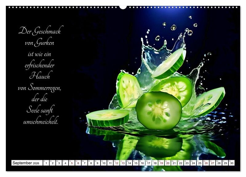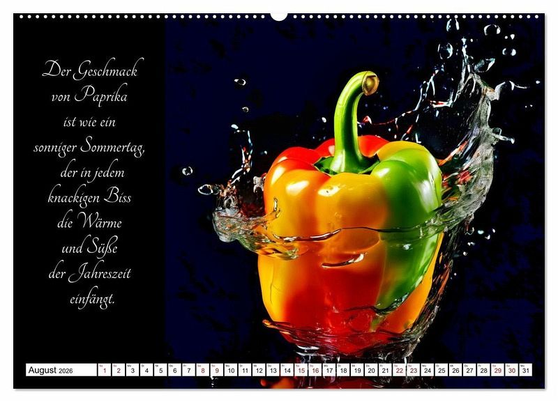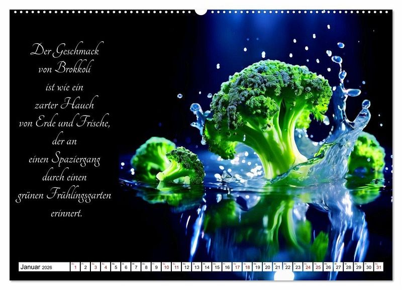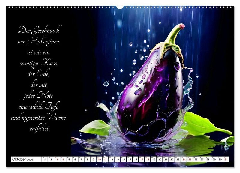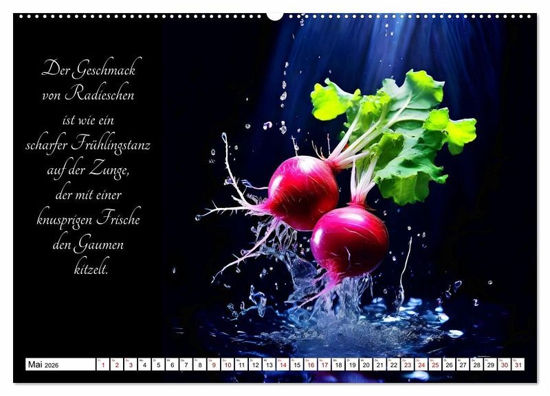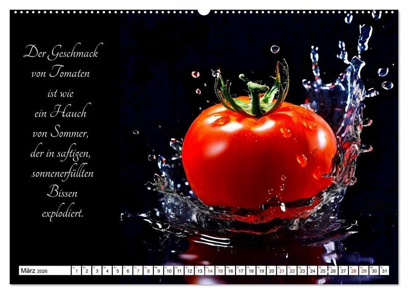 Tauchen Sie ein in die Welt der gärtnerischen Geschmacks-Explosionen - mit dem KI generierten Kalender, der Sie durch ein Jahr voller poetischer Gemüsegenüsse führt. Lassen Sie sich von den delikaten Aromen und der Vielfalt der Natur inspirieren, während jedes Monatsblatt Ihnen die Schönheit und den Geschmack frischer Gemüsesorten näherbringt. Entdecken Sie die Kunst der Gartenfrüchte und erleben Sie, wie sinnlich und verführerisch Gemüse sein kann.