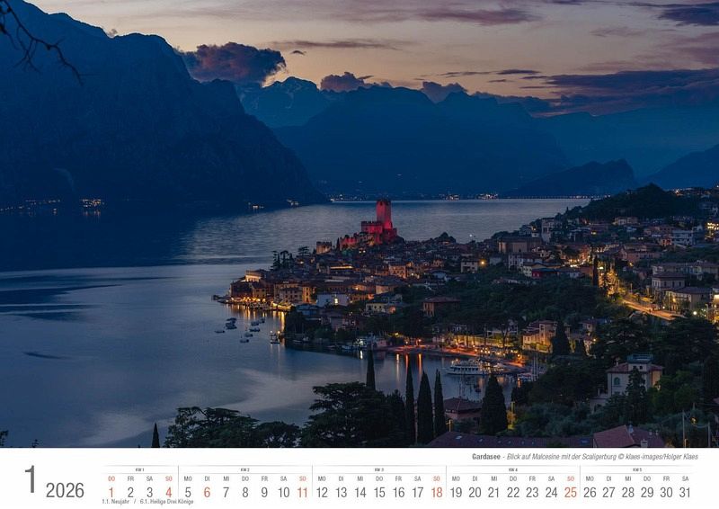 Der hochwertig verarbeitete Bildkalender Gardasee 2026 zeigt mit seinen stimmungsvollen und repräsentativen Aufnahmen den Gardasee und viele seiner Städte. 14 Seiten, Bilderdruck matt 170 g + stabiler Graukarton aus 1 mm Buchbinderpappe als Rückwand vor dem Indexblatt. Format A3, ca. 42 x 30 cm quer, Spiralbindung.