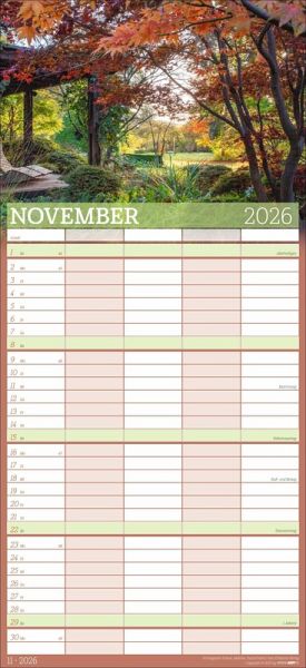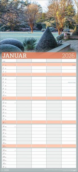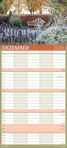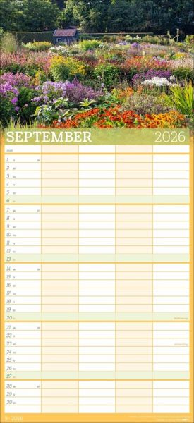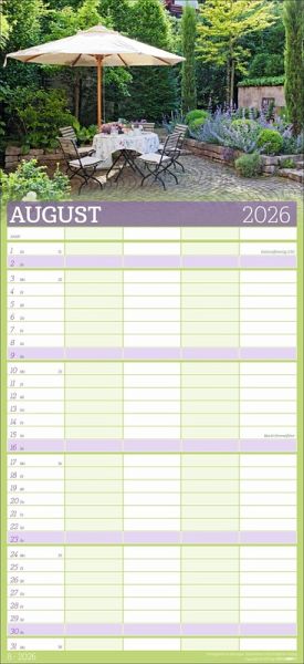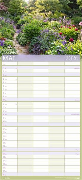 - Zauberhafte Traumgärten: Der große Familienkalender 2026 für Gartenfreunde von Jung bis Alt - 12 Garten-Oasen im Wandel der Jahreszeiten: Mit idyllischen Naturmotiven, eingefangen von der bekannten Fotografin Marion Nickig - Besser Termine jonglieren mit unseren Familienplanern: 5 Spalten Platz im praktischen 22x48 cm Hochformat, inklusive Feiertage, Schulferien und 3-Monats-Vorschau - Foto-Familienkalender mit Stil und Finesse: Jahr für Jahr das perfekte Geschenk für Hobbygärtner:innen und Naturbegeisterte- Einfach schöner planen: Die Familienkalender von Weingarten im Athesia Kalenderverlag