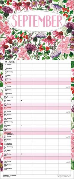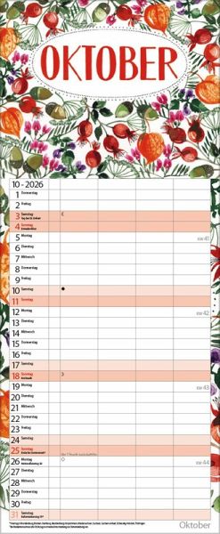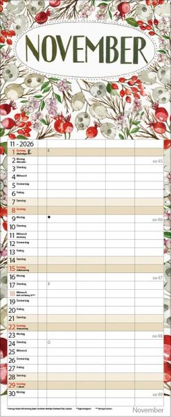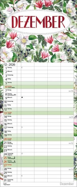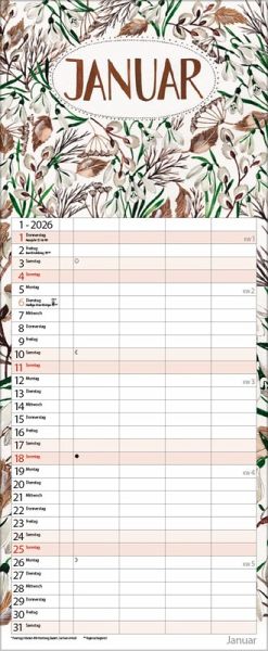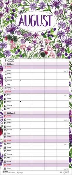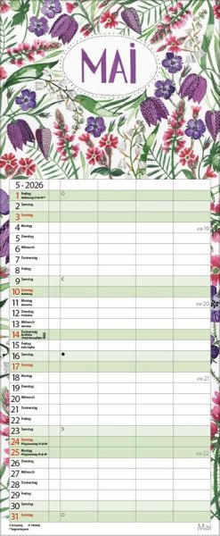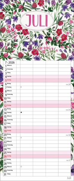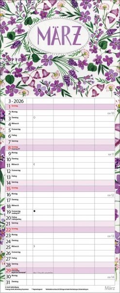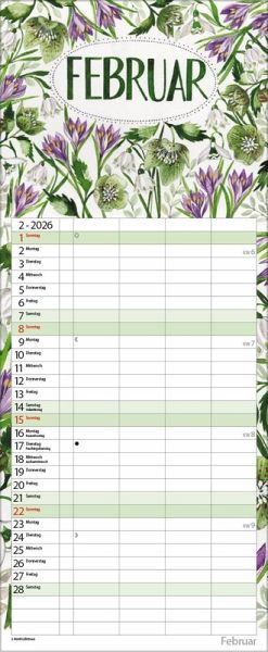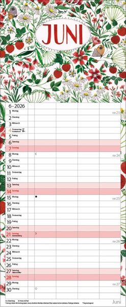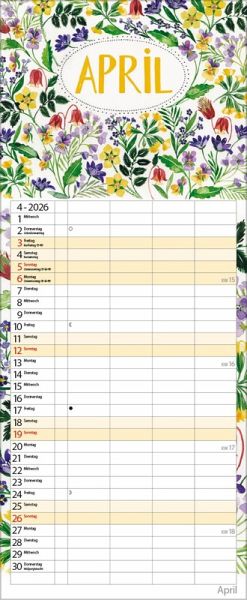 Übersichtlicher Familienplaner für bis zu 4 Personen; sehr stabile Rückwand; 19 x 46 cm Jeden Monat eine süße Zeichnung über den Spalten. Ohne störende Bilder in den Spalten Dickes, umweltfreundliches FSC Papier; leichte Beschreibbarkeit, auch mit Bunt- und Bleistiften Deutsches Kalendarium mit regionalen Feiertagen für Deutschland, Österreich und Schweiz Farblich hervorgehobene Sonn- und Feiertage, sowie Anzeige der Zeitumstellung