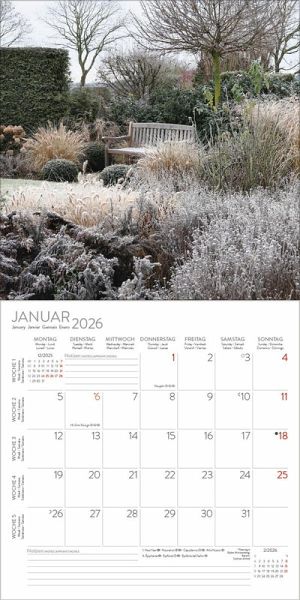 Wandkalender im Format: 30 x 30 cm; Offenes Format: 30 x 60 cm; umweltfreundliches FSC PapierJede Kalenderseite mit großem Bild und viel Platz im Kalendarium für Notizen und TermineMehrsprachiges Kalendarium: DE/GB/FR/IT/ES mit Feiertagen für D/A/CH/GB/FR/IT/ESRegionale Ferienzeiten für DE/A/CHMonatsübersicht für den jeweiligen Vor- und Nachmonat; Jahresübersicht