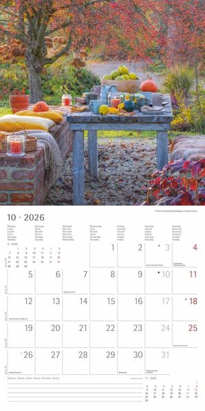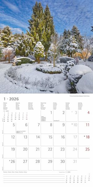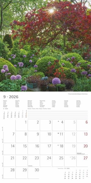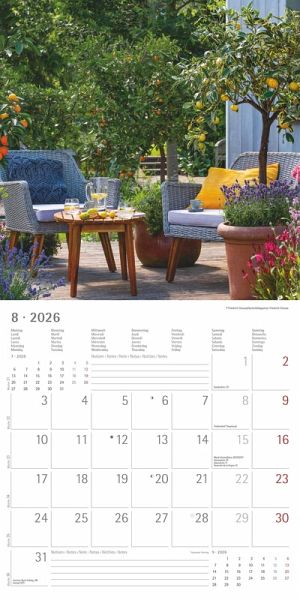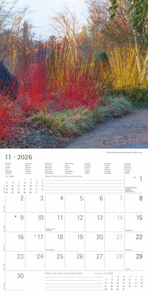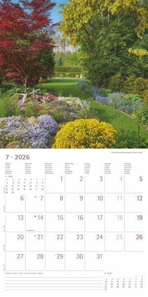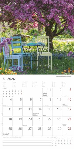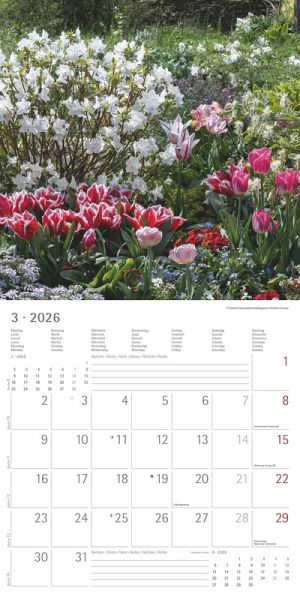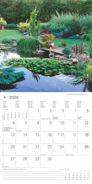 Das übersichtliche Kalendarium, welches Monat für Monat zahlreiche Zusatzinformationen liefert (z. B. Monatsübersichten, Ferientermine oder Mondphasen) und auch viel Platz für Ihre Notizen bietet, fügt sich harmonisch unter den Fotomotiven an. Dieser Kalender begeistert mit ästhetischen Gartenfotografien und schmückt jeden Raum.