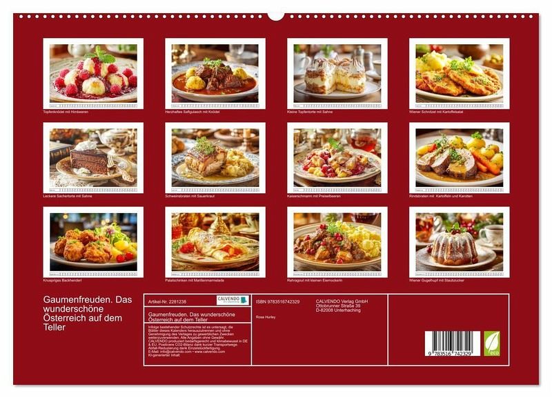 PREMIUM-LINIE - Brillanter Fotokalender mit 12 wunderschönen Motiven, Kunstdruck in Hochglanz in Museumsqualität.QUALITÄT - edle Materialien, stabile Rückwand mit 2 innovativen Einstecktaschen für eine optimale Präsentation an der Wand.NACHHALTIG - deutliche Abfallreduzierung durch bedarfsgerechte Einzelstückfertigung, umweltfreundliches FSC-zertifiziertes Papier, Produktion in Deutschland, klimabewusste Logistik.PERFEKTES GESCHENK - Kalender für Freunde und Familie, für Kinder und Erwachsene, jung und alt, zu Weihnachten, Geburtstag oder zwischendurch.Ein Genusskalender, der jeden Monat ein ikonisches österreichisches Gericht in stimmungsvollen Bildern präsentiert von Autor(in): Rose Hurley
