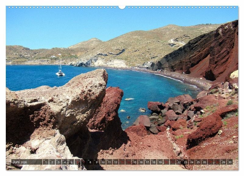 Juni: Profitis-Ilias-Massiv mit Blick auf Red Beach, Santorin, Griechenland
