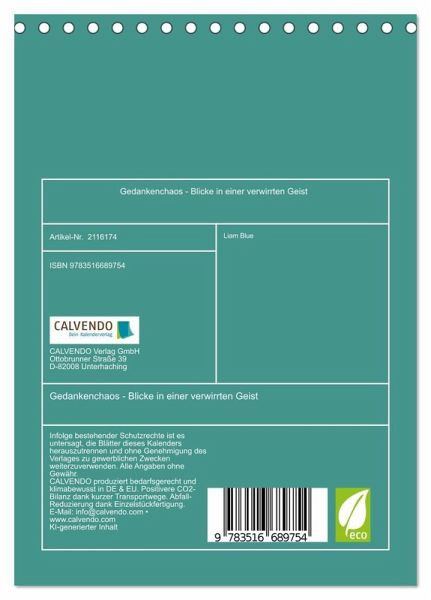 Tauchen Sie ein in die faszinierende Welt des "Gedankenchaos" - ein Kunstkalender voller surrealer Motive, die Blicke in einen verwirrten Geist erlauben. Inspiriert von Traum- und Alptraumbildern offenbaren die KI-generierten Kunstwerke komplexe, vielschichtige Emotionen und Gedankenwelten in eindrucksvoller visueller Form. Dieses außergewöhnliche Werk lädt zum Staunen, Nachdenken und Eintauchen in die Tiefen des menschlichen Geistes ein - ein Muss für alle Liebhaber moderner Kunst und außergewöhnlicher Fantasie.