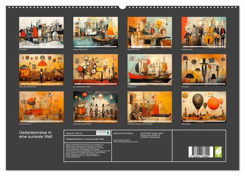 Lassen Sie sich begeistern von einer Welt der surrealen Impressionen. Jeder Monat offenbart ein faszinierendes Zusammenspiel von abstrakten Konzepten und surrealen Elementen, die die Grenzen der Vorstellungskraft herausfordern. Von extravaganten Fahrradtouren durch das Labyrinth der Gedanken bis zu metaphysischen Melodien, die die Zeit überschreiten - dieser Kalender lädt dazu ein, die Welt des Surrealismus auf eine ganz neue, visuelle Weise zu erkunden. Die Bilder sind mit Unterstützung von KI entstanden und wurden mit Bildbearbeitungsprogrammen optimiert.