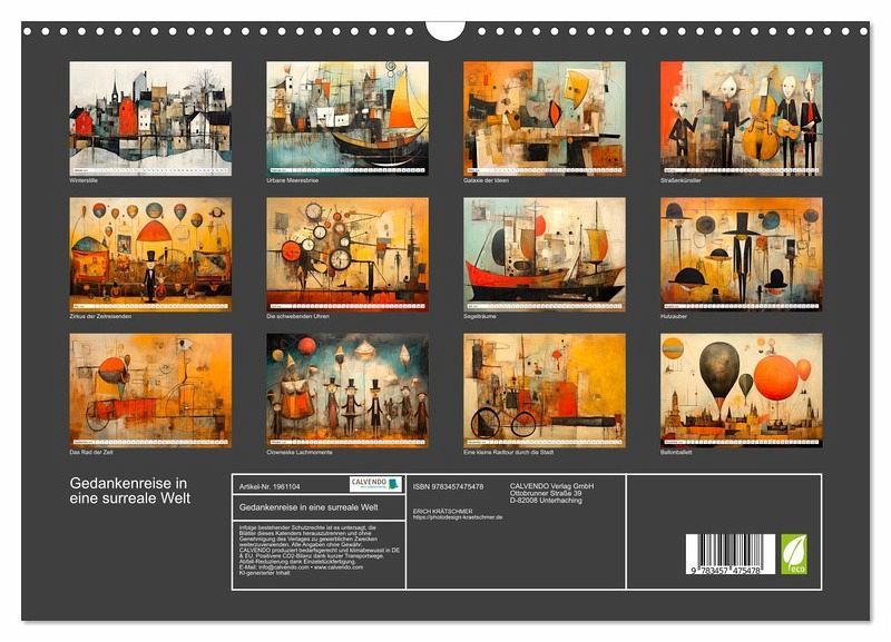 Lassen Sie sich begeistern von einer Welt der surrealen Impressionen. Jeder Monat offenbart ein faszinierendes Zusammenspiel von abstrakten Konzepten und surrealen Elementen, die die Grenzen der Vorstellungskraft herausfordern. Von extravaganten Fahrradtouren durch das Labyrinth der Gedanken bis zu metaphysischen Melodien, die die Zeit überschreiten - dieser Kalender lädt dazu ein, die Welt des Surrealismus auf eine ganz neue, visuelle Weise zu erkunden. Die Bilder sind mit Unterstützung von KI entstanden und wurden mit Bildbearbeitungsprogrammen optimiert.