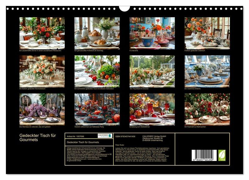 Lassen Sie sich von diesen Tischdekorationen inspirieren. Vom gemütlichen Abendessen zu Hause bis hin zu festlichen Zusammenkünften zeigt dieser Kalender stilvoll gedeckte Tische für jeden Anlass. Denn das Auge ist mit. Egal für welchen Anlass - sei es eine Hochzeit, Weihnachten, Halloween oder um Urlaubserinnerungen zu feiern - ein wunderschön gedeckter Tisch sorgt für unvergessliche Momente. Dem Fotokünstler Peter Roder ist es gelungen stilvolle KI-Bilder zu gestalten und zusammen zu stellen, die schon beim Ansehen Lust auf ein köstliches Essen machen. Dies ist ein Kalender für alle, die Spaß und Freude am Genießen haben.