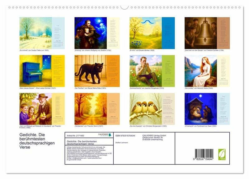Dieser Kalender vereint die schönsten Gedichte von Klassik bis Moderne: Von Goethes düsterem "Erlkönig" bis zu Kästners emotionaler "Sachliche Romanze", von Mörikes Frühlingsgedicht "Er ist's" bis zum Winter mit "Es schneit" von Falke. Alle Gedichte wurden kongenial im warm-realistischen Malstil von Steffani Lehmann mit Unterstützung einer KI illustriert. Ein Kalender wie ein Gedicht!