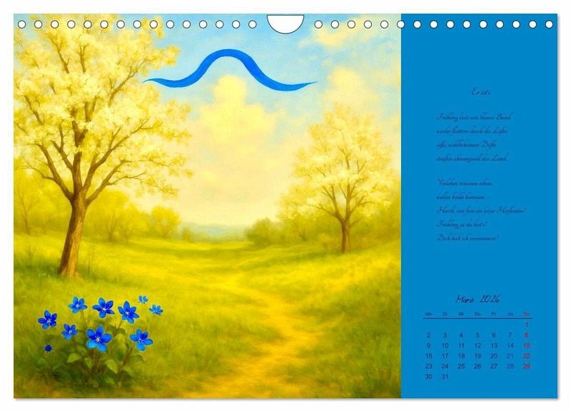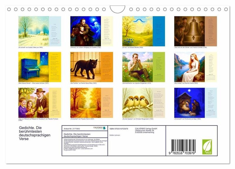 Dieser Kalender vereint die schönsten Gedichte von Klassik bis Moderne: Von Goethes düsterem "Erlkönig" bis zu Kästners emotionaler "Sachliche Romanze", von Mörikes Frühlingsgedicht "Er ist's" bis zum Winter mit "Es schneit" von Falke. Alle Gedichte wurden kongenial im warm-realistischen Malstil von Steffani Lehmann mit Unterstützung einer KI illustriert. Ein Kalender wie ein Gedicht!