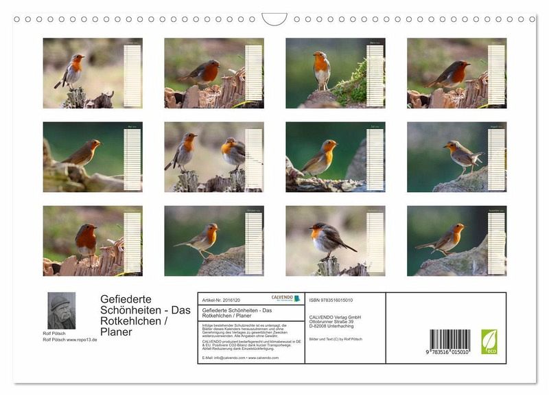 QUALITÄT - Hochwertiger Fotokalender mit 12 wunderschönen Motiven auf lichtbeständigem Bilderdruckpapier, robuste Spiralbindung mit Aufhängebügel.NACHHALTIG - deutliche Abfallreduzierung durch bedarfsgerechte Einzelstückfertigung, umweltfreundliches FSC-zertifiziertes Papier, Produktion in Deutschland, klimabewusste Logistik.PERFEKTES GESCHENK - Kalender für Freunde und Familie, für Kinder und Erwachsene, jung und alt, zu Weihnachten, Geburtstag oder zwischendurch.VIELFALT - Bildkalender in verschiedenen Formaten, z.B. DIN A5, DIN A4, DIN A3 sowie DIN A2. Ob Naturmotiv, Gemälde oder Fotos, ideal für ein persönliches Wohlfühlambiente.Das Rotkehlchen, eine gefiederte Schönheit die der Fotograf Rolf Pötsch in dreizehn verschiedenen Nahaufnahmen festgehalten hat. von Autor(in): ropo13