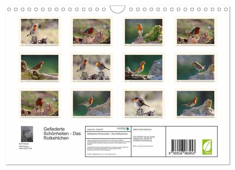 QUALITÄT - Hochwertiger Fotokalender mit 12 wunderschönen Motiven auf lichtbeständigem Bilderdruckpapier, robuste Spiralbindung mit Aufhängebügel.NACHHALTIG - deutliche Abfallreduzierung durch bedarfsgerechte Einzelstückfertigung, umweltfreundliches FSC-zertifiziertes Papier, Produktion in Deutschland, klimabewusste Logistik.PERFEKTES GESCHENK - Kalender für Freunde und Familie, für Kinder und Erwachsene, jung und alt, zu Weihnachten, Geburtstag oder zwischendurch.VIELFALT - Bildkalender in verschiedenen Formaten, z.B. DIN A5, DIN A4, DIN A3 sowie DIN A2. Ob Naturmotiv, Gemälde oder Fotos, ideal für ein persönliches Wohlfühlambiente.Das Rotkehlchen, eine gefiederte Schönheit die der Fotograf Rolf Pötsch in dreizehn verschiedenen Nahaufnahmen festgehalten hat. von Autor(in): ropo13