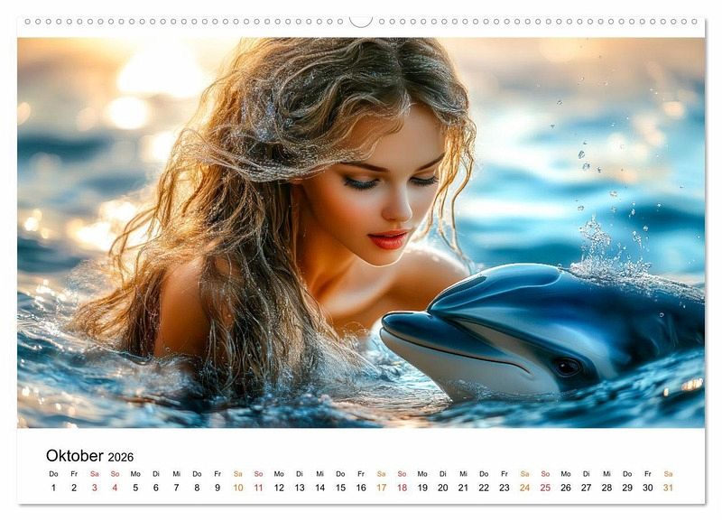 Tauchen Sie ein in die magische Welt der Meerjungfrauen, eine Reise in eine andere Welt. Lassen Sie sich von den einzigartigen, zauberhaften KI-Bildern einer geheimnisvollen Meerjungfrau verzaubern. Jedes Motiv erzählt eine eigene Geschichte und fängt die Magie der Tiefen ein. Entdecken Sie die Eleganz einer Meerjungfrau, die durch versunkene Wracks gleitet oder sehen Sie sie in Harmonie mit liebenswerten Bewohnern der Meere schwimmen. Eingehüllt in die Mystik des Ozeans, strahlt sie eine zeitlose Schönheit aus - geheimnisvoll, voller Fantasie. Der Kalender ist perfekt für jeden Meerjungfrauen-Fan und alle, die die Magie des Wassers lieben.