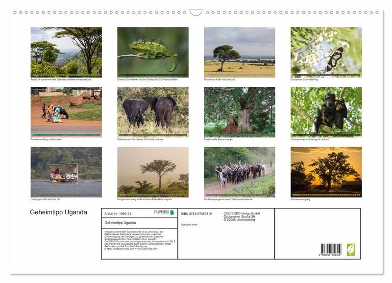 QUALITÄT - Hochwertiger Fotokalender mit 12 wunderschönen Motiven auf lichtbeständigem Bilderdruckpapier, robuste Spiralbindung mit Aufhängebügel.NACHHALTIG - deutliche Abfallreduzierung durch bedarfsgerechte Einzelstückfertigung, umweltfreundliches FSC-zertifiziertes Papier, Produktion in Deutschland, klimabewusste Logistik.PERFEKTES GESCHENK - Kalender für Freunde und Familie, für Kinder und Erwachsene, jung und alt, zu Weihnachten, Geburtstag oder zwischendurch.VIELFALT - Bildkalender in verschiedenen Formaten, z.B. DIN A5, DIN A4, DIN A3 sowie DIN A2. Ob Naturmotiv, Gemälde oder Fotos, ideal für ein persönliches Wohlfühlambiente.In Uganda begegnet man viel Natur aber (noch) wenig Touristen. von Autor(in): Roswitha Irmer