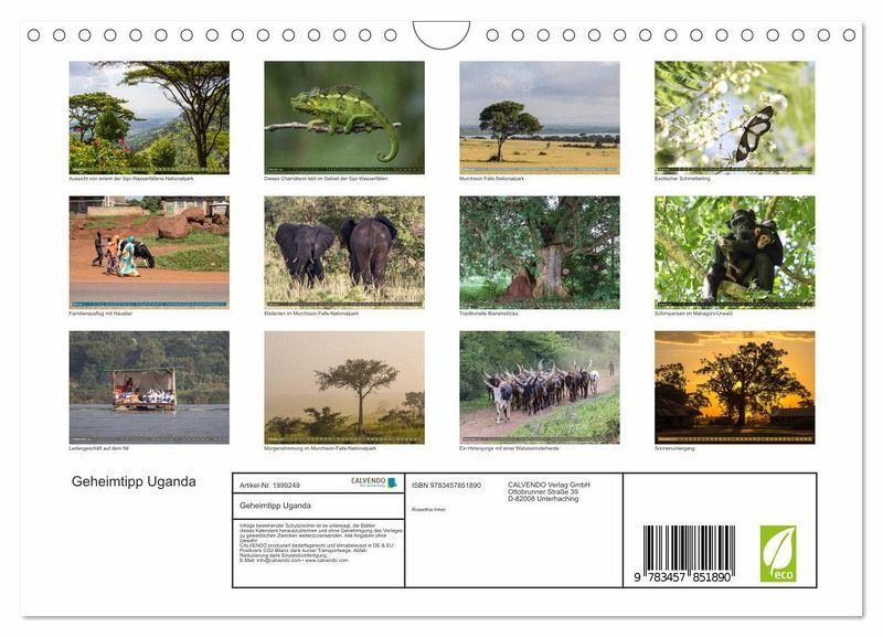 QUALITÄT - Hochwertiger Fotokalender mit 12 wunderschönen Motiven auf lichtbeständigem Bilderdruckpapier, robuste Spiralbindung mit Aufhängebügel.NACHHALTIG - deutliche Abfallreduzierung durch bedarfsgerechte Einzelstückfertigung, umweltfreundliches FSC-zertifiziertes Papier, Produktion in Deutschland, klimabewusste Logistik.PERFEKTES GESCHENK - Kalender für Freunde und Familie, für Kinder und Erwachsene, jung und alt, zu Weihnachten, Geburtstag oder zwischendurch.VIELFALT - Bildkalender in verschiedenen Formaten, z.B. DIN A5, DIN A4, DIN A3 sowie DIN A2. Ob Naturmotiv, Gemälde oder Fotos, ideal für ein persönliches Wohlfühlambiente.In Uganda begegnet man viel Natur aber (noch) wenig Touristen. von Autor(in): Roswitha Irmer