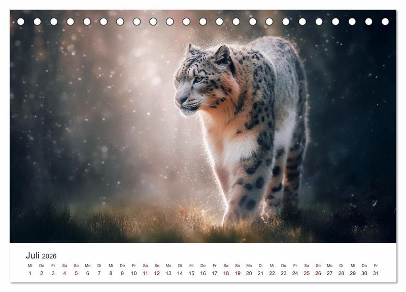 Dieser KI-generierte Kalender nimmt dich mit in die stille, raue Welt der Schneeleoparden - jener faszinierenden Raubkatzen, die fast lautlos durch Schnee und Stein gleiten. Jede Seite zeigt ein einzigartiges Bildmoment, begleitet von einem poetischen Titel, der ihre Anmut, Wildheit und Einsamkeit einfängt.