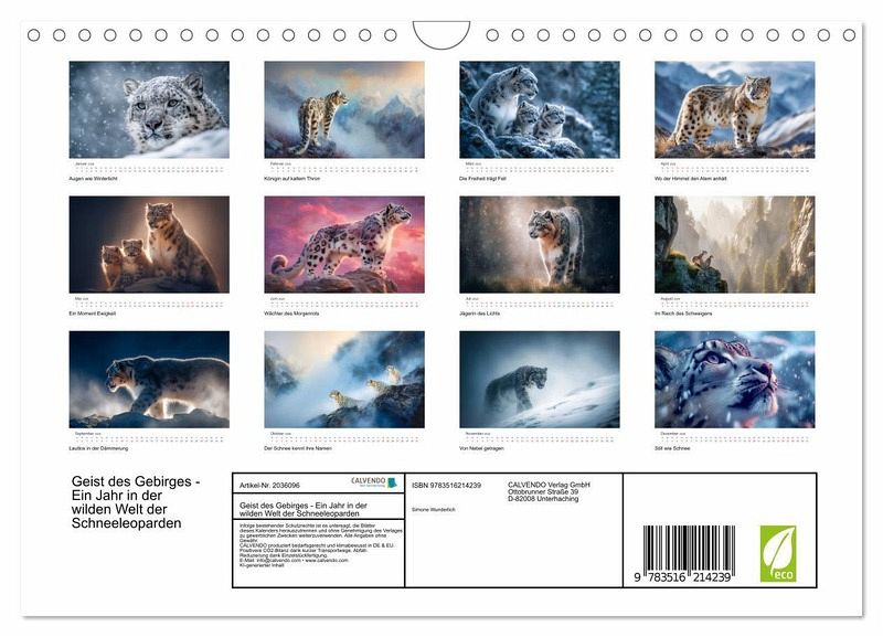 QUALITÄT - Hochwertiger Fotokalender mit 12 wunderschönen Motiven auf lichtbeständigem Bilderdruckpapier, robuste Spiralbindung mit Aufhängebügel.NACHHALTIG - deutliche Abfallreduzierung durch bedarfsgerechte Einzelstückfertigung, umweltfreundliches FSC-zertifiziertes Papier, Produktion in Deutschland, klimabewusste Logistik.PERFEKTES GESCHENK - Kalender für Freunde und Familie, für Kinder und Erwachsene, jung und alt, zu Weihnachten, Geburtstag oder zwischendurch.VIELFALT - Bildkalender in verschiedenen Formaten, z.B. DIN A5, DIN A4, DIN A3 sowie DIN A2. Ob Naturmotiv, Gemälde oder Fotos, ideal für ein persönliches Wohlfühlambiente.Ein Jahr mit Schneeleoparden von Autor(in): Simone Wunderlich