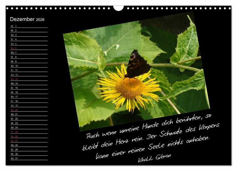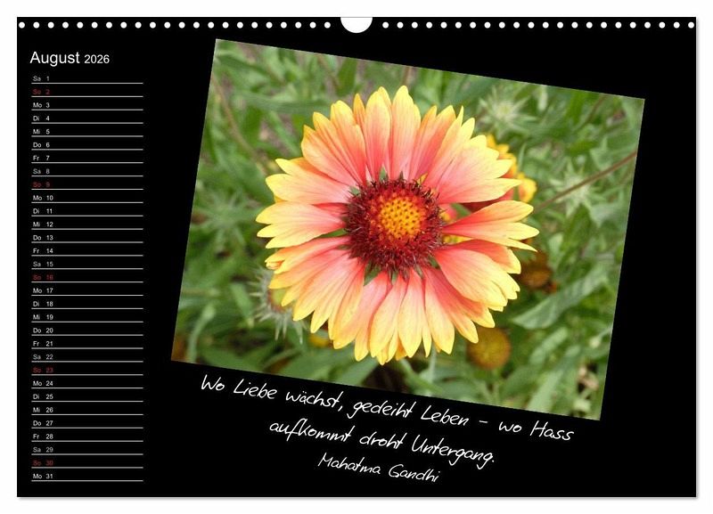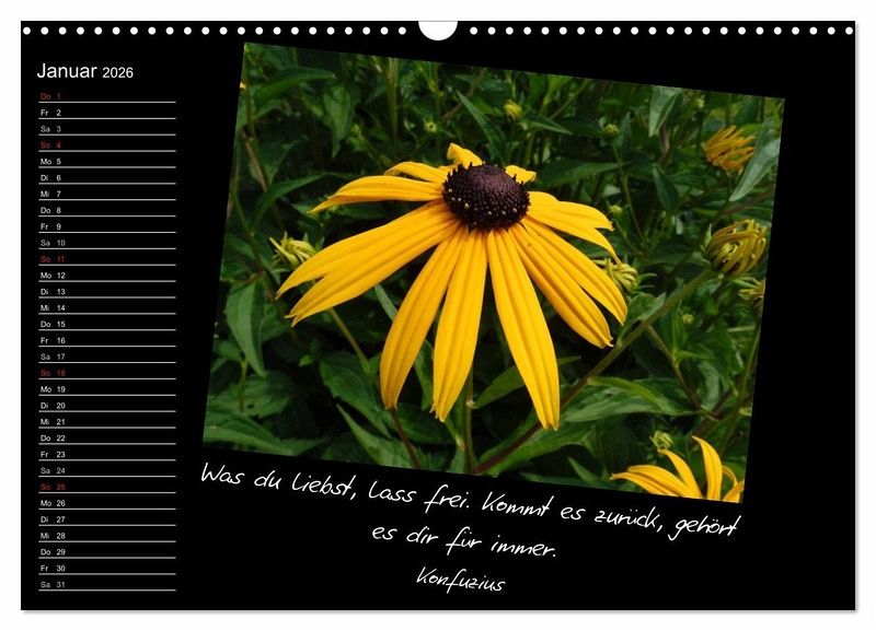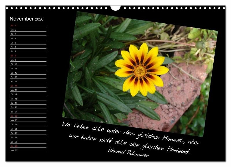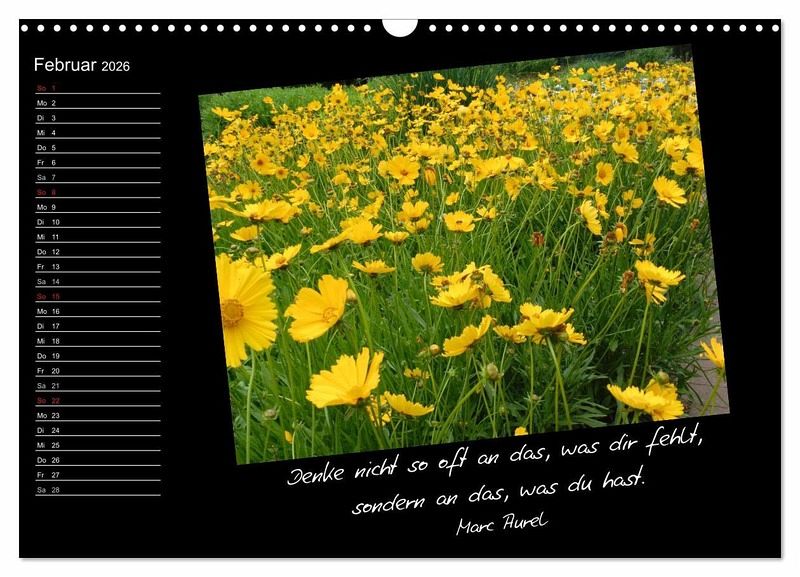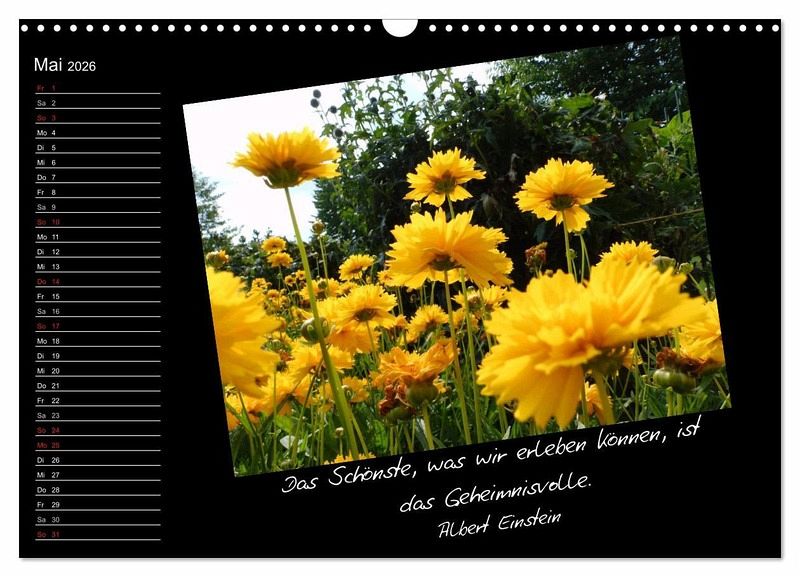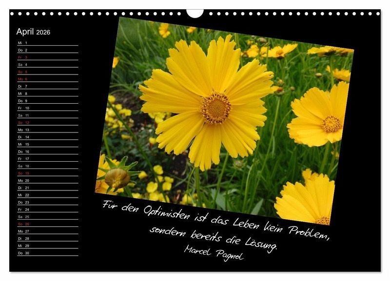 Ein Farbenfroher Kalender der zum Träumen einlädt. Die Farbe gelb symbolisiert die Helligkeit, die Lebenslust und den Optimismus. Dazu ein Zitat berühmter Persönlichkeiten. Holen sie sich einen sonnigen Kalender nach Hause und erfreuen sich daran.
