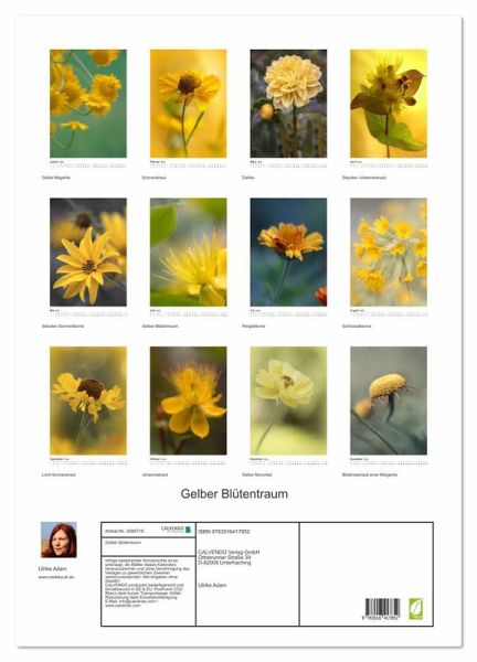 QUALITÄT - Hochwertiger Fotokalender mit 12 wunderschönen Motiven auf lichtbeständigem Bilderdruckpapier, robuste Spiralbindung mit Aufhängebügel.NACHHALTIG - deutliche Abfallreduzierung durch bedarfsgerechte Einzelstückfertigung, umweltfreundliches FSC-zertifiziertes Papier, Produktion in Deutschland, klimabewusste Logistik.PERFEKTES GESCHENK - Kalender für Freunde und Familie, für Kinder und Erwachsene, jung und alt, zu Weihnachten, Geburtstag oder zwischendurch.VIELFALT - Bildkalender in verschiedenen Formaten, z.B. DIN A5, DIN A4, DIN A3 sowie DIN A2. Ob Naturmotiv, Gemälde oder Fotos, ideal für ein persönliches Wohlfühlambiente.Gelbe frische Blütenfotos verzaubern uns das ganze Jahr von Autor(in): Fotokunst Ulrike Adam