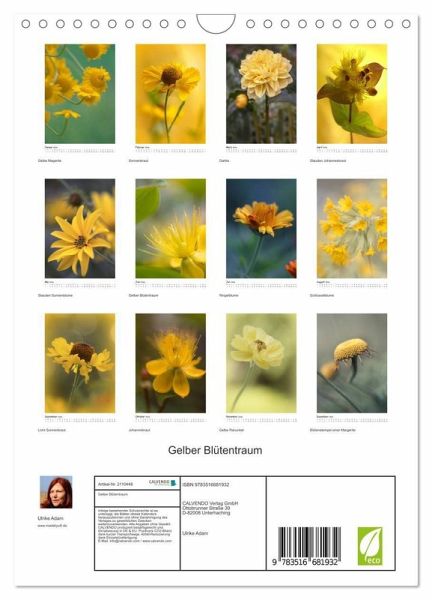 QUALITÄT - Hochwertiger Fotokalender mit 12 wunderschönen Motiven auf lichtbeständigem Bilderdruckpapier, robuste Spiralbindung mit Aufhängebügel.NACHHALTIG - deutliche Abfallreduzierung durch bedarfsgerechte Einzelstückfertigung, umweltfreundliches FSC-zertifiziertes Papier, Produktion in Deutschland, klimabewusste Logistik.PERFEKTES GESCHENK - Kalender für Freunde und Familie, für Kinder und Erwachsene, jung und alt, zu Weihnachten, Geburtstag oder zwischendurch.VIELFALT - Bildkalender in verschiedenen Formaten, z.B. DIN A5, DIN A4, DIN A3 sowie DIN A2. Ob Naturmotiv, Gemälde oder Fotos, ideal für ein persönliches Wohlfühlambiente.Gelbe frische Blütenfotos verzaubern uns das ganze Jahr von Autor(in): Fotokunst Ulrike Adam