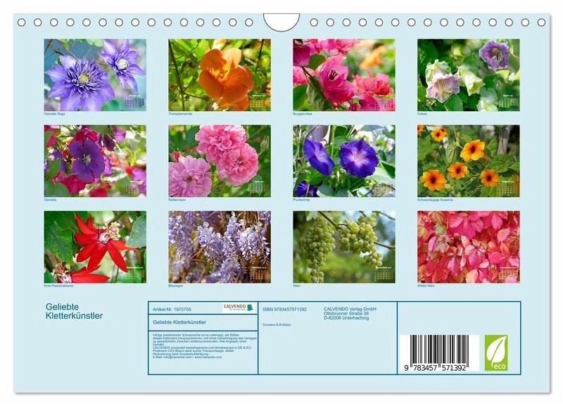 Sie schlingen, ranken, klettern, hangeln: Kletterpflanzen bedecken öde Mauern, streben an Rankhilfen in die Höhe, fungieren als Sichtschutz und Schattenspender. Sie tun das mit Ausdauer, und in Zeiten der Blüte mit oft unglaublicher Form- und Farbenpracht. Damit sind sie echte Lieblinge, die in fast jedem Garten vorkommen. Dieser Kalender zeigt eine gut sortierte Auswahl der vielseitigen Gipfelstürmer in voller Blüte oder zur Erntezeit.