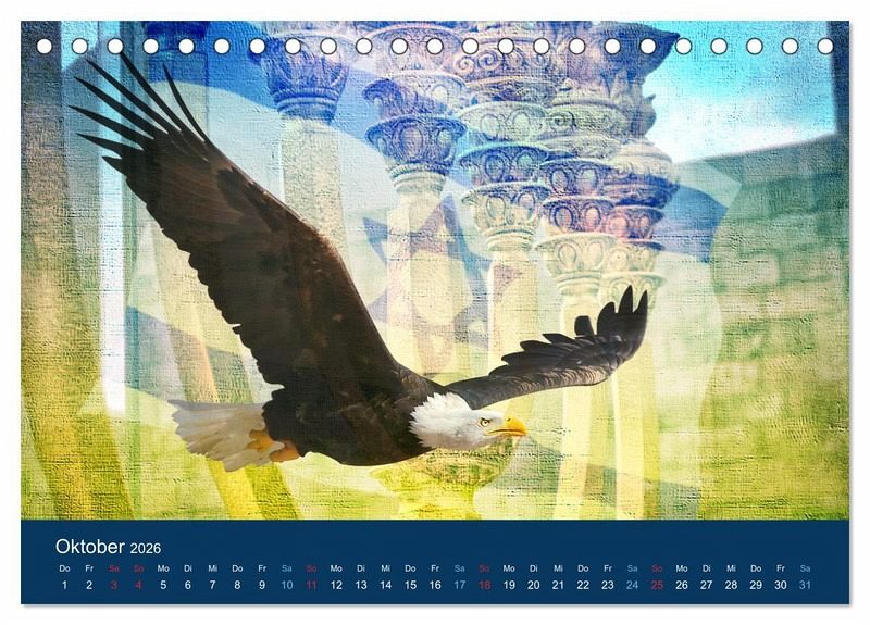Oktober: Adler im Flug vor Israelflagge, Menorah und Westmauer Design Marena Zara Camadini