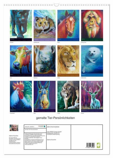 Für die Künstlerin Sabine Koschier sind Tiere Persönlichkeiten. Ihre Acrylmalerei zeigt Porträts selbstbewusster tierischer Individuen mit einer Seele, deren Blicke berühren. In diesem farbenfrohen Monatskalender sind heimische, wilde und exotische Tier-Persönlichkeiten versammelt: Hahn, Hamster, Pferd und Kuh, Fuchs, Luchs, Esel, Hirsch und Sattelrobbe, Panther, Löwe, Nashorn und Orang-Utan.