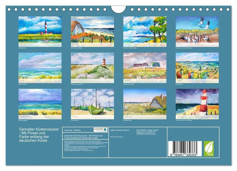 Erleben Sie den Zauber der deutschen Küsten in unserem Kalender "Gemalter Küstenzauber". Tauchen Sie ein in die malerischen Landschaften der Nord- und Ostseeküste, mit ihren charmanten Reetdachhäusern, majestätischen Leuchttürmen und idyllischen Fischerbooten. Jedes Bild ist ein Kunstwerk, das die Schönheit und Vielfalt unserer Küstenlandschaften einfängt und Sie mit auf eine malerische Reise nimmt. Lassen Sie sich von den beruhigenden Farben und den malerischen Details verzaubern, während Sie das ganze Jahr über die maritime Atmosphäre genießen.