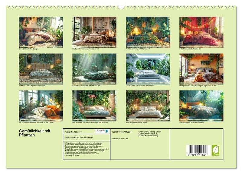 PREMIUM-LINIE - Brillanter Fotokalender mit 12 wunderschönen Motiven, Kunstdruck in Hochglanz in Museumsqualität.QUALITÄT - edle Materialien, stabile Rückwand mit 2 innovativen Einstecktaschen für eine optimale Präsentation an der Wand.NACHHALTIG - deutliche Abfallreduzierung durch bedarfsgerechte Einzelstückfertigung, umweltfreundliches FSC-zertifiziertes Papier, Produktion in Deutschland, klimabewusste Logistik.PERFEKTES GESCHENK - Kalender für Freunde und Familie, für Kinder und Erwachsene, jung und alt, zu Weihnachten, Geburtstag oder zwischendurch.Schlafzimmer mit viel Grün von Autor(in): Liselotte Brunner-Klaus