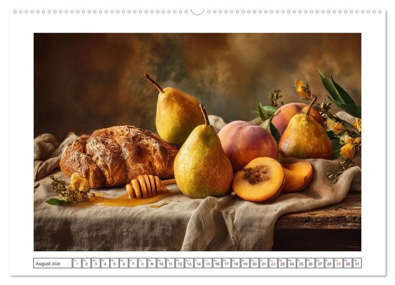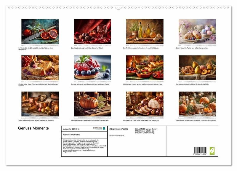 Dieser Kalender feiert die Kunst des Kochens und das Staunen der Sinne. Zwölf Monatsbilder voller Farbe, Textur und Geschmack sind komponiert wie Gemälde alter Meister. Ein Genuss für alle, die Schönheit schmecken können. Alle hier gezeigten Bilder wurden mit Sorgfalt, Liebe und mit Hilfe einer KI generiert. Abschließend werden sie mit Bildbearbeitungsprogrammen überarbeitet und in den Kalender eingefügt.