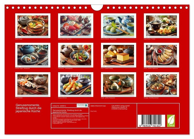 QUALITÄT - Hochwertiger Fotokalender mit 12 wunderschönen Motiven auf lichtbeständigem Bilderdruckpapier, robuste Spiralbindung mit Aufhängebügel.NACHHALTIG - deutliche Abfallreduzierung durch bedarfsgerechte Einzelstückfertigung, umweltfreundliches FSC-zertifiziertes Papier, Produktion in Deutschland, klimabewusste Logistik.PERFEKTES GESCHENK - Kalender für Freunde und Familie, für Kinder und Erwachsene, jung und alt, zu Weihnachten, Geburtstag oder zwischendurch.VIELFALT - Bildkalender in verschiedenen Formaten, z.B. DIN A5, DIN A4, DIN A3 sowie DIN A2. Ob Naturmotiv, Gemälde oder Fotos, ideal für ein persönliches Wohlfühlambiente.Kunstvoll inszenierte Gerichte wecken die Lust auf Japans Kulinarik von Autor(in): Rose Hurley