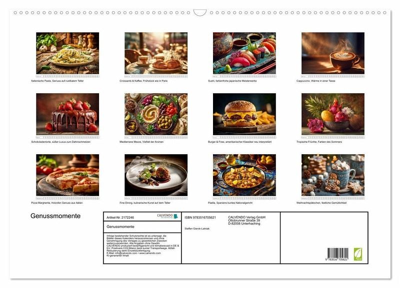 Genuss, der inspiriert Monat für Monat! Dieser Food & Kulinarik Kalender vereint die schönsten kulinarischen Highlights der Welt: Von italienischer Pasta über japanisches Sushi bis hin zu festlichen Weihnachtsleckereien. Perfekt für Genießer, Foodies und alle, die gutes Essen lieben. Ein Kalender, der Appetit auf mehr macht. Alle hier gezeigten Bilder wurden mit Sorgfalt, Liebe und mit Hilfe einer KI generiert. Abschließend werden sie mit Bildbearbeitungsprogrammen überarbeitet und in den Kalender eingefügt.