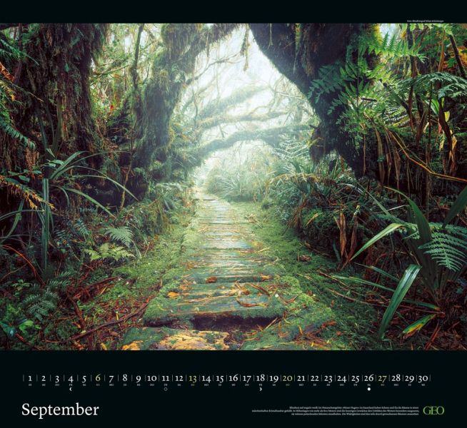 Dank des großzügigen Formats können Sie mit diesem GEO-Wandkalender 2026 fast in die wunderschöne Natur eintauchen, die sich Ihnen hier Monat für Monat in hochwertigen Fotografien eröffnet. Das deutschsprachige Kalendarium darunter wurde bewusst dezent gehalten, um nicht von den wundervollen Naturaufnahmen abzulenken.