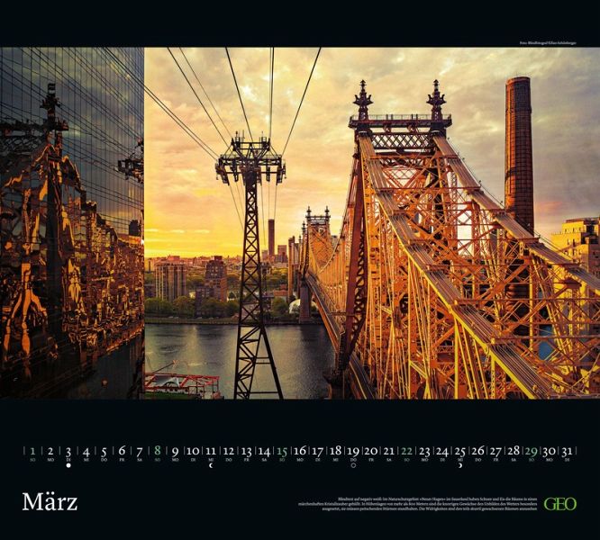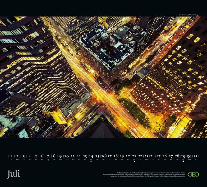 Dank des großzügigen Formats können Sie mit diesem GEO-Posterkalender 2026 fast in die quirlige Stadt eintauchen, die sich Ihnen hier Monat für Monat in hochwertigen Fotografien präsentiert. Das deutschsprachige Kalendarium darunter wurde bewusst dezent gehalten, um nicht von den wundervollen Stadtansichten abzulenken.