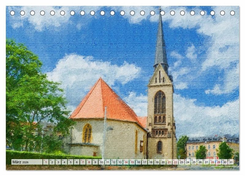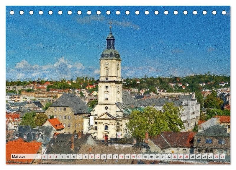 Gera, die Stadt an der weißen Elster, hat viele Sehenswürdigkeiten zu bieten. Ihr historischer Stadtkern, der beliebte Hofwiesenpark am Fuß des Schloss Osterstein oder verschiedene Kirchen laden zu einem Besuch ein. Im Gemälde verwischt der bekannte Eindruck zu etwas ganz Neuem.