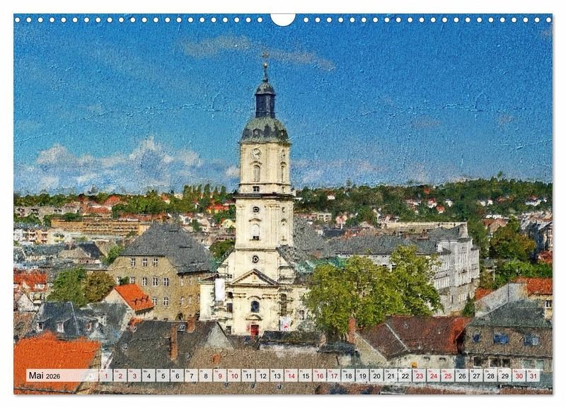 Gera, die Stadt an der weißen Elster, hat viele Sehenswürdigkeiten zu bieten. Ihr historischer Stadtkern, der beliebte Hofwiesenpark am Fuß des Schloss Osterstein oder verschiedene Kirchen laden zu einem Besuch ein. Im Gemälde verwischt der bekannte Eindruck zu etwas ganz Neuem.