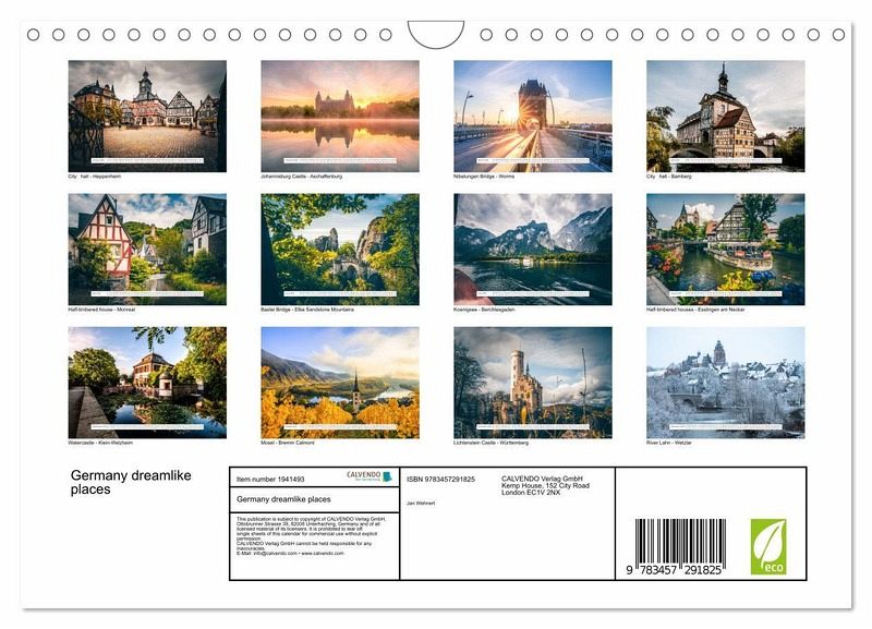 QUALITY - High-quality photo calendar with 12 beautiful images on light-resistant paper, robust spiral binding with hanger.SUSTAINABLE - Significant waste reduction due to print-on-demand production, environmentally friendly FSC-certified paper, produced in the UK, climate-conscious logistical processes.PERFECT GIFT - calendars for friends and family, for children, all ages and all occasions, from Christmas to birthdays and everything in between.LOTS OF CHOICE - Wall calendars in different sizes (DIN A4 and DIN A3), for any topic and personal taste, featuring photography, painting and illustrations.Germany Hidden Pearls: Calendar Full of Beauty, author: Jan Wehnert