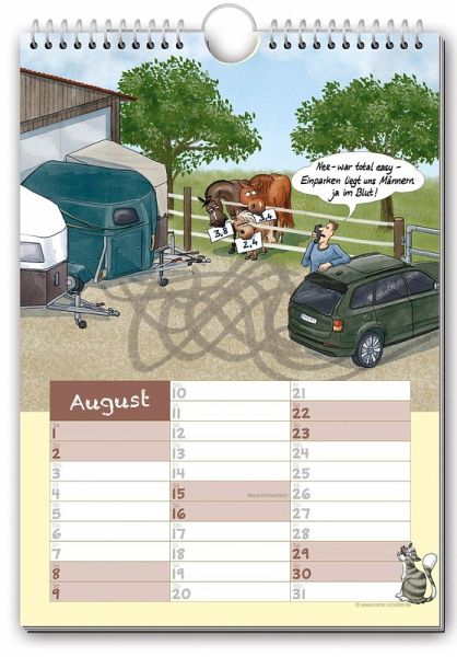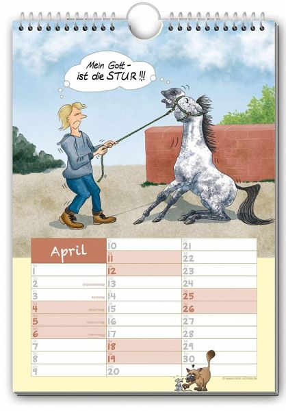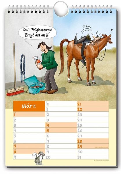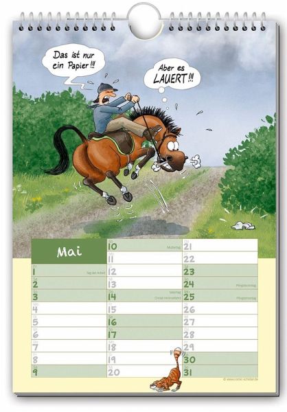 Das perfekte Geschenk für Reiter und andere Pferdenarren - darf in keinem Reiterstübchen fehlen! Der Comic-Kalender "Geschichten vom Pferd 2026" ist das ideale Geschenk für Reiter und Pferdefreunde. Dieser witzige Kalender sollte in keinem Reiterstübchen fehlen! Lustige Reiter-Cartoons und genügend Platz zum Eintragen von Terminen - perfekt für alle Pferdefreunde. Für alle Wasserschlauch-bei-Frost-Bezwinger, die chronischen Miteinsteller-Vermeider, alle, die die unschätzbar unterhaltsamen Eigenschaften von Fellglanzspray zu schätzen wissen, für alle, die täglich mit besonders "sturen" Exemplaren umgehen (menschlicher oder pferdischer Art), für alle ignoranten Reiter, die von ihren fürsorglichen Rössern ständig vor lauernden Gefahren gewarnt werden müssen, für alle unfreiwilligen Kraftfutter-Plantagen-Besitzer, für alle Pony-Verzierer und -Bezofper, für alle ungekrönten Hänger-Einpark-Könige, für alle, denen ihre Pferde wahrhaft Flügel verleihen, für alle unschuldigen Opfer des mysteriösen "Zeitlochs Stall", für die Trockenreiter der einen oder anderen Art und alle, deren Reittier leiderleider schon anderweitig besetzt wurde. Alles selbst erlebt oder ausgedacht! 210 x 297 mm, Wire-O-Bindung mit Aufhänger, 14 Seiten