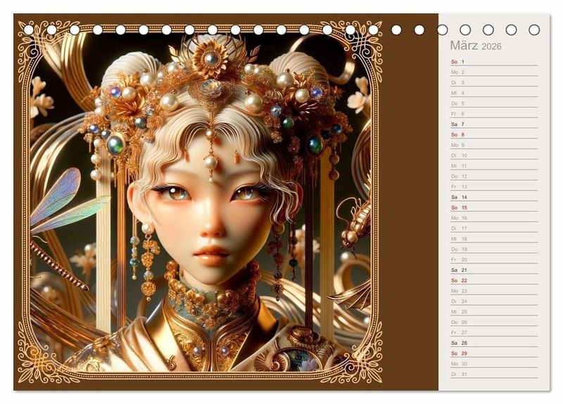 Der Kalender - Gesichter als Leinwand - präsentiert zwölf einzigartige, von KI-generierte Porträts. Jedes Bild ist eine Hommage an die feine Kunst des Haarstylings und Make-ups, das Puppengesichtern Leben einhaucht. Erlebe eine Kollektion, die übernatürliche Schönheit mit detailreicher Handwerkskunst verbindet. Lass dich verzaubern von skulpturalen Geweben, die zu glänzendem Haar und opulenten Verzierungen werden. Ein Muss für alle, die Design, Fantasie und die faszinierenden Möglichkeiten künstlicher Intelligenz lieben.