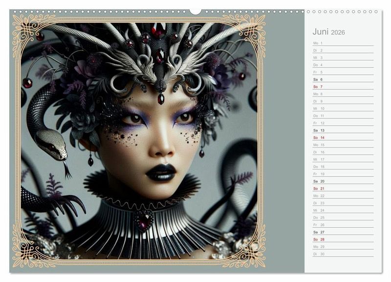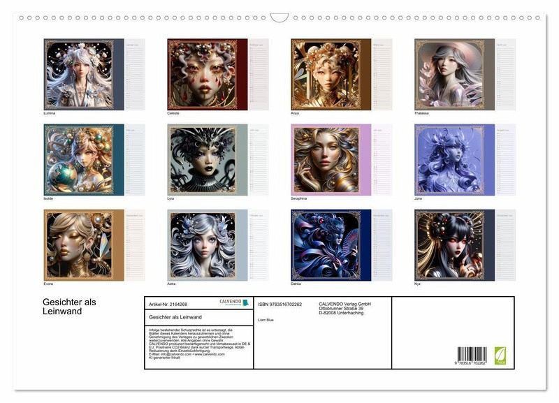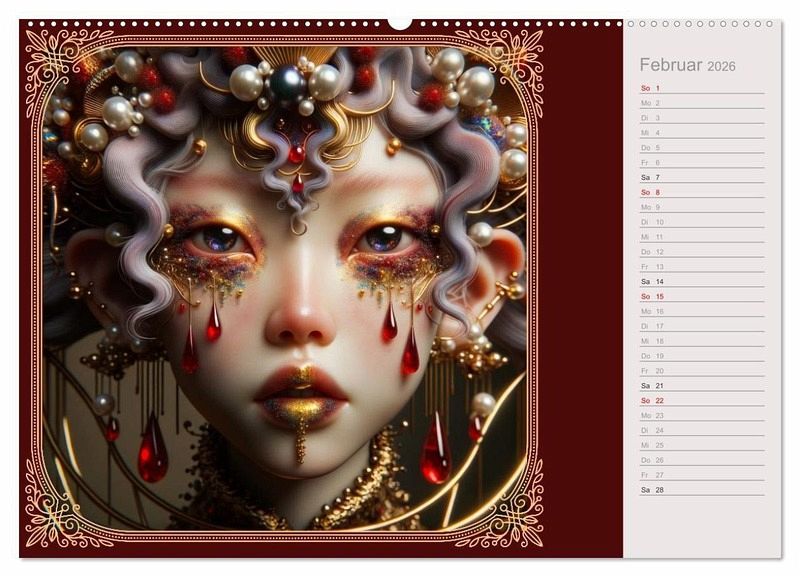 Der Kalender - Gesichter als Leinwand - präsentiert zwölf einzigartige, von KI-generierte Porträts. Jedes Bild ist eine Hommage an die feine Kunst des Haarstylings und Make-ups, das Puppengesichtern Leben einhaucht. Erlebe eine Kollektion, die übernatürliche Schönheit mit detailreicher Handwerkskunst verbindet. Lass dich verzaubern von skulpturalen Geweben, die zu glänzendem Haar und opulenten Verzierungen werden. Ein Muss für alle, die Design, Fantasie und die faszinierenden Möglichkeiten künstlicher Intelligenz lieben.