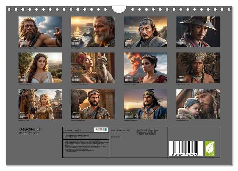 Eine Reise durch die Zeit der untergegangenen Kulturen. Dieser KI- Kalender zeigt in liebevoll gestalteten Portraits eine Auswahl an interessanten Kulturen, die uns bis heute faszinieren. Ein ideales Geschenk für jeden Geschichtsfreund!