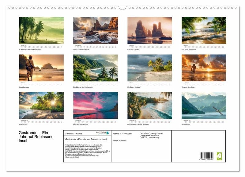 Entdecke die Geheimnisse einer einsamen Insel mit unserem KI - erstellten Robinson - Crusoe - Kalender! Jeder Monat enthüllt die unberührte Schönheit und die wilden Abenteuer, denen Robinson gegenübersteht. Tauche ein in die faszinierende Natur, lausche den Melodien des Dschungels und genieße die Einsamkeit der Inselstrände. Dieser Kalender ist perfekt für alle, die von der Freiheit und Magie einer unentdeckten Insel träumen.