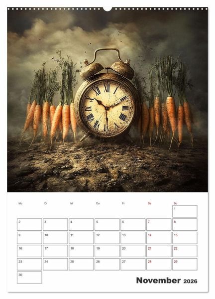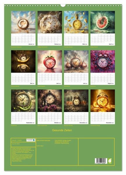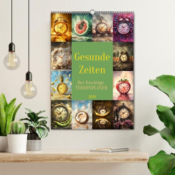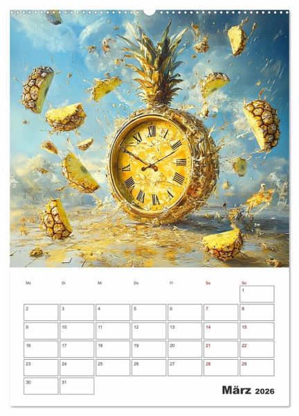 Der fruchtig coole Planer zeigt von einer KI erstellte surreal gestaltete Verbindungen zwischen Obst und Gemüse sowie der immerwährenden Zeit. Damit Sie diese immer im Blick haben und keinen Termin mehr verpassen, bieten die Monatsfelder genug Platz für Ihre wichtigen Eintragungen.