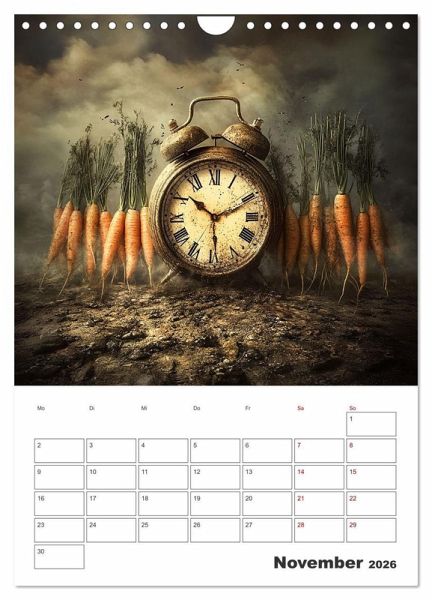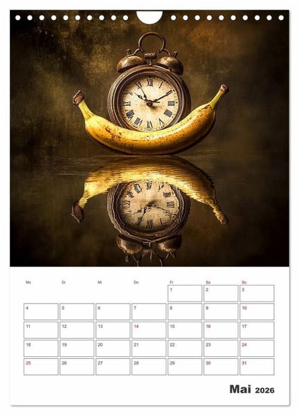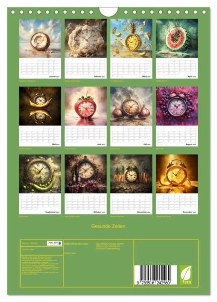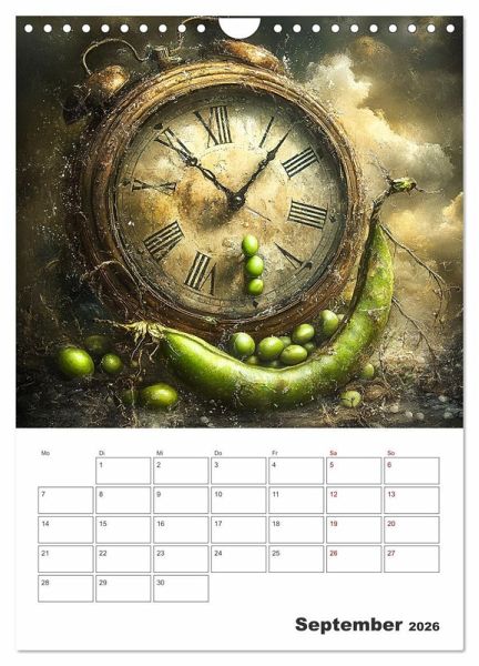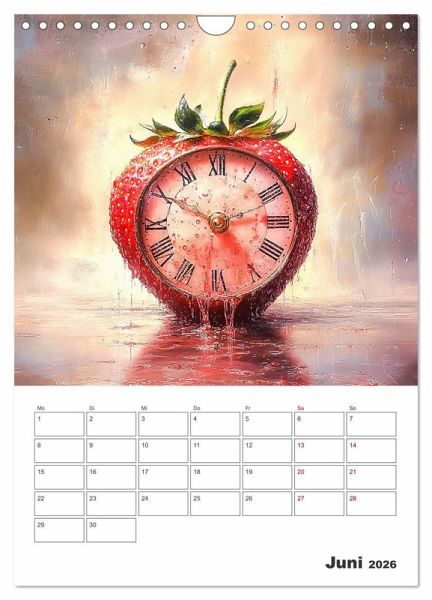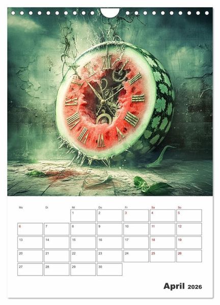 Der fruchtig coole Planer zeigt von einer KI erstellte surreal gestaltete Verbindungen zwischen Obst und Gemüse sowie der immerwährenden Zeit. Damit Sie diese immer im Blick haben und keinen Termin mehr verpassen, bieten die Monatsfelder genug Platz für Ihre wichtigen Eintragungen.