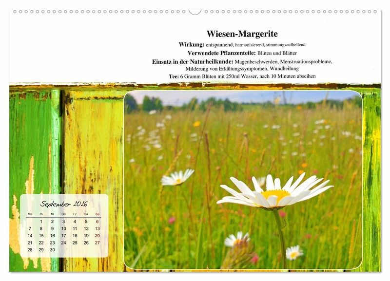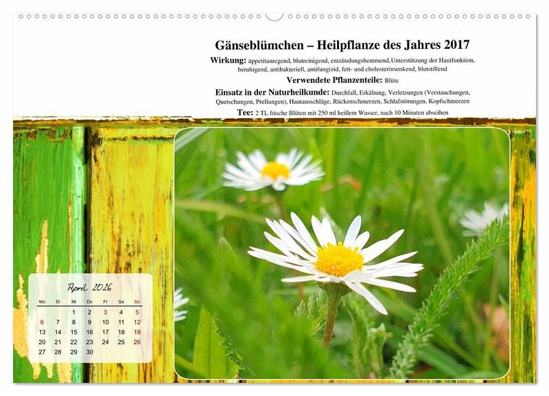 Wusstest du, dass das Gänseblümchen u.a. entzündungshemmend und blutreinigend wirkt? Das uns allen vertraute Blümchen wurde sogar Heilpflanze des Jahres 2017. Es wird bei auch bei Kopfschmerzen, Schlafstörungen oder Erkältungssymptomen eigesetzt. Du kannst ganz einfach einen Tee mit den kleinen weißen Blüten zubereiten. Der Kalender stellt 12 Heilpflanzen vor, die du am Alpenrand finden kannst. Aus manchen lässt sich ein wirkungsvoller Tee zubereiten.