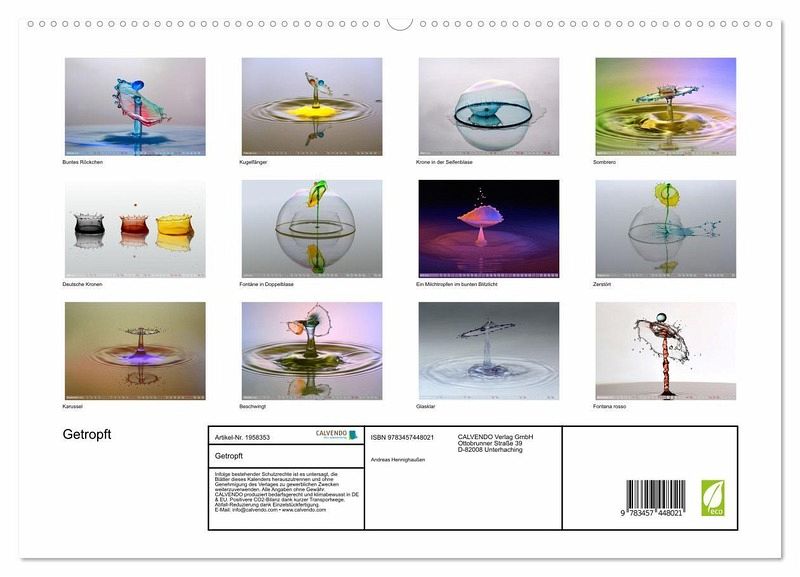 PREMIUM-LINIE - Brillanter Fotokalender mit 12 wunderschönen Motiven, Kunstdruck in Hochglanz in Museumsqualität.QUALITÄT - edle Materialien, stabile Rückwand mit 2 innovativen Einstecktaschen für eine optimale Präsentation an der Wand.NACHHALTIG - deutliche Abfallreduzierung durch bedarfsgerechte Einzelstückfertigung, umweltfreundliches FSC-zertifiziertes Papier, Produktion in Deutschland, klimabewusste Logistik.PERFEKTES GESCHENK - Kalender für Freunde und Familie, für Kinder und Erwachsene, jung und alt, zu Weihnachten, Geburtstag oder zwischendurch.Die Tropfenfotografie ist faszinierend, weil sie Situationen abbildet, die für das menschliche Auge nicht wahrnehmbar sind. von Autor(in): Andreas Hennighaußen