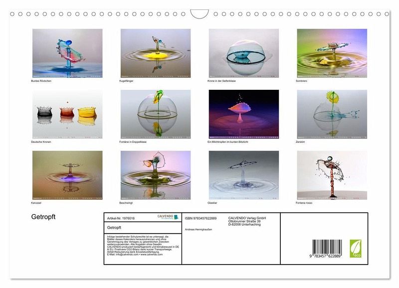 QUALITÄT - Hochwertiger Fotokalender mit 12 wunderschönen Motiven auf lichtbeständigem Bilderdruckpapier, robuste Spiralbindung mit Aufhängebügel.NACHHALTIG - deutliche Abfallreduzierung durch bedarfsgerechte Einzelstückfertigung, umweltfreundliches FSC-zertifiziertes Papier, Produktion in Deutschland, klimabewusste Logistik.PERFEKTES GESCHENK - Kalender für Freunde und Familie, für Kinder und Erwachsene, jung und alt, zu Weihnachten, Geburtstag oder zwischendurch.VIELFALT - Bildkalender in verschiedenen Formaten, z.B. DIN A5, DIN A4, DIN A3 sowie DIN A2. Ob Naturmotiv, Gemälde oder Fotos, ideal für ein persönliches Wohlfühlambiente.Die Tropfenfotografie ist faszinierend, weil sie Situationen abbildet, die für das menschliche Auge nicht wahrnehmbar sind. von Autor(in): Andreas Hennighaußen