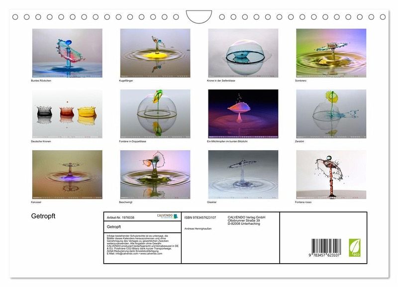 QUALITÄT - Hochwertiger Fotokalender mit 12 wunderschönen Motiven auf lichtbeständigem Bilderdruckpapier, robuste Spiralbindung mit Aufhängebügel.NACHHALTIG - deutliche Abfallreduzierung durch bedarfsgerechte Einzelstückfertigung, umweltfreundliches FSC-zertifiziertes Papier, Produktion in Deutschland, klimabewusste Logistik.PERFEKTES GESCHENK - Kalender für Freunde und Familie, für Kinder und Erwachsene, jung und alt, zu Weihnachten, Geburtstag oder zwischendurch.VIELFALT - Bildkalender in verschiedenen Formaten, z.B. DIN A5, DIN A4, DIN A3 sowie DIN A2. Ob Naturmotiv, Gemälde oder Fotos, ideal für ein persönliches Wohlfühlambiente.Die Tropfenfotografie ist faszinierend, weil sie Situationen abbildet, die für das menschliche Auge nicht wahrnehmbar sind. von Autor(in): Andreas Hennighaußen